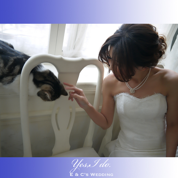 整片白色的佈景,新郎新娘 (還有一隻貓) 就構成我心中最浪漫最美的畫面